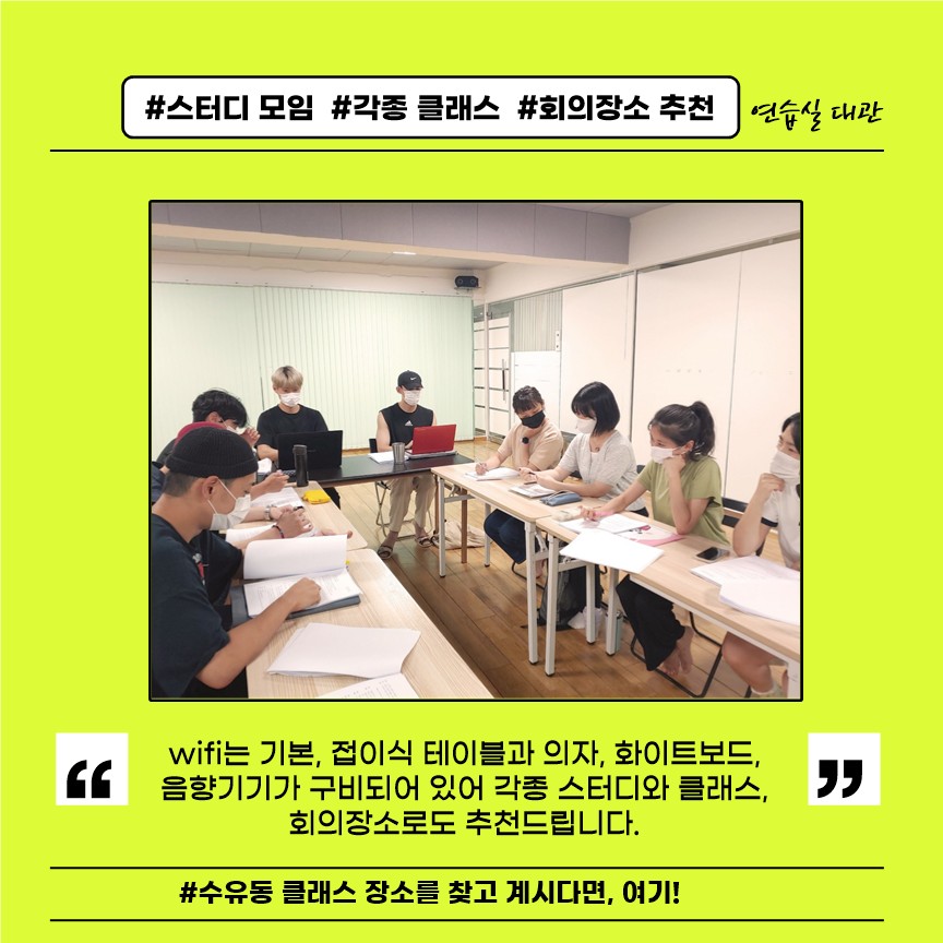 “wifi는 기본, 접이식 테이블과 의자, 화이트보드, 음향기기가 구비되어 있어 각종 스터디와 클래스, 회의장소로도 추천드립니다.
