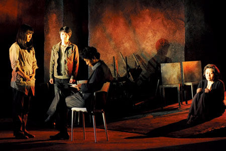 극장에 들어서자 마자 깜짝 놀랐다. 명동예술극장의 무대 디자인은 언제나 대만족이었지만 오늘의 이 연극만큼 감동을 주었던 무대는 없었다. 거대한 콘크리트의 잔재가 무대 위에 널려있고, 무대 뒤쪽에는 기울어진 피아노가, 무대 앞쪽에는 고급스런 느낌의 책상이 놓여 있다. 피아노가 있는 곳은 나왈과 와합이 사랑을 나누었던 숲이, 무대 앞쪽에는 잔느와 시몽이 유서의 내용을 듣는 변호사 사무실이 된다.