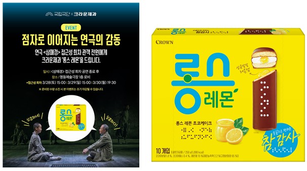 점자 과자 ‘롱스 레몬’은 크라운제과가 2016년부터 펼치고 있는 실종아동을 위한 희망과자에 이어 언제나 맛있게 즐기는 과자에 점자로 따뜻한 세상을 위한 감사와 공감의 메세지를 전하기 위한 시도다. 공연이 종료된 후 국립극단 명동예술극장 로비에 별도 마련된 이벤트 공간에서 당일 관람권을 제시하면 티켓 1매당 ‘롱스 레몬’ 1케이스를 받을 수 있다.