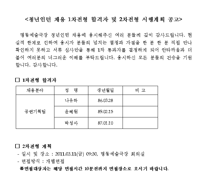 <청년인턴 채용 1차전형 합격자 및 2차전형 시행계획 공고>