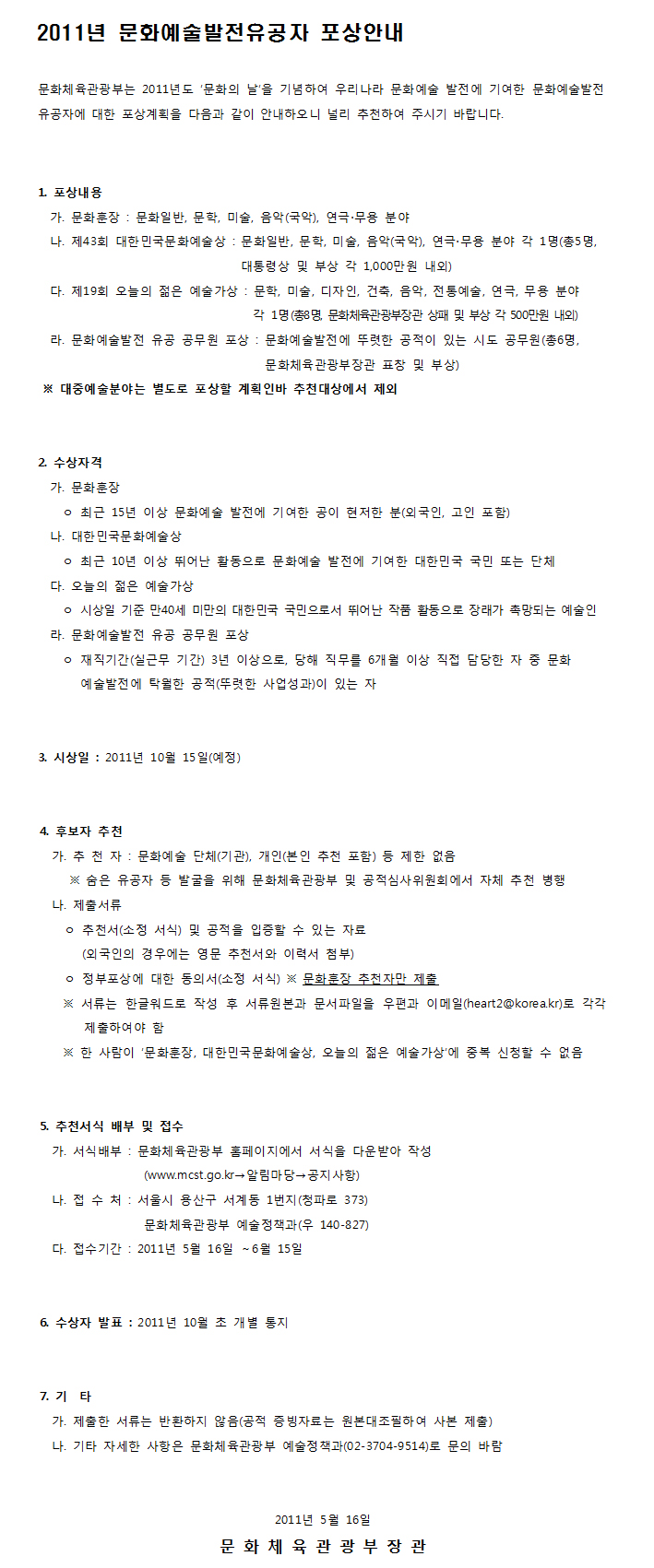 2011년 문화예술발전유공자 포상안내