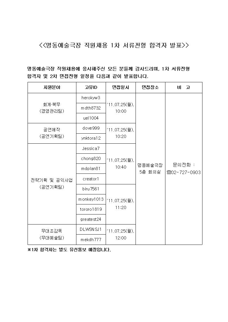 직원채용 1차전형 합격자 발표 및 2차전형 안내