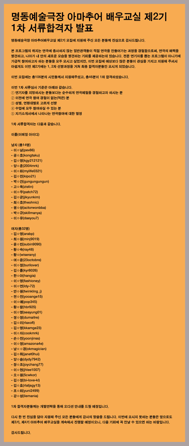 아마추어 배우교실 제2기 1차 서류합격자 발표