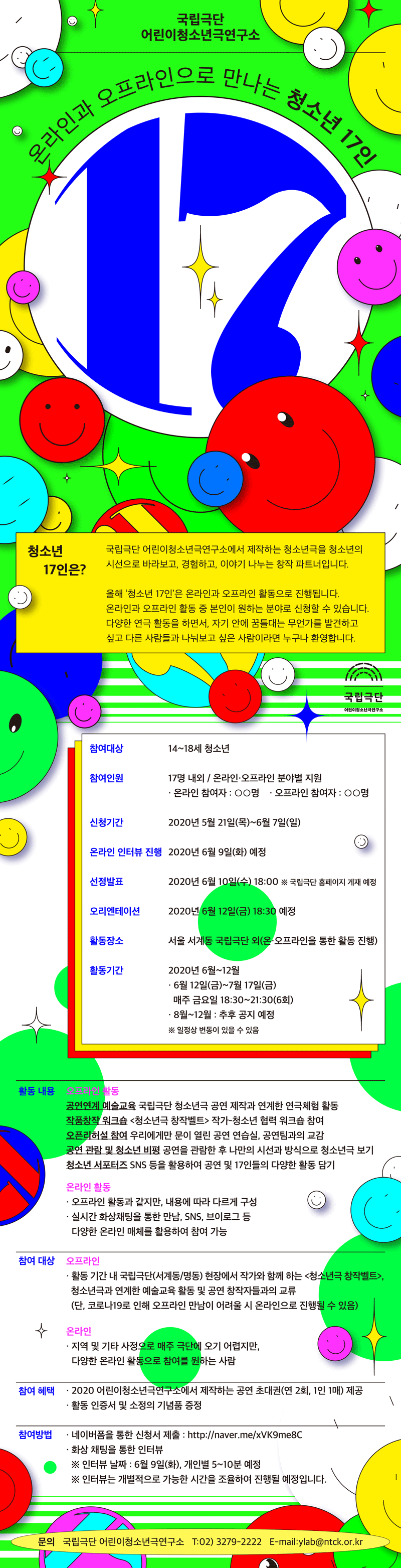 청소년 17인은? 국립극단 어린이청소년극연구소에서 제작하는 청소년극을 청소년의 시선으로 바라보고, 경험하고, 이야기 나누는 창작 파트너입니다. 올해 ‘청소년 17인’은 온라인과 오프라인 활동으로 진행됩니다. 온라인과 오프라인 활동 중 본인이 원하는 분야로 신청할 수 있습니다. 다양한 연극 활동을 하면서, 자기 안에 꿈틀대는 무언가를 발견하고 싶고 다른 사람들과 나눠보고 싶은 사람이라면 누구나 환영합니다. |