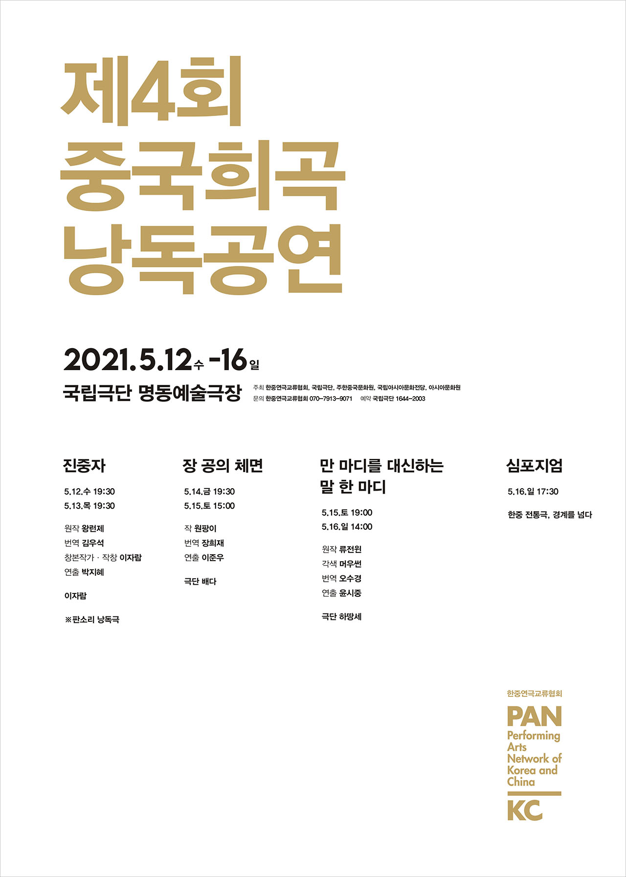※ [제4회 중국희곡 낭독공연]은 한중연극교류협회, 국립극단, 주한중국문화원, 국립아시아문화전당, 아시아문화원이 공동주최 합니다.