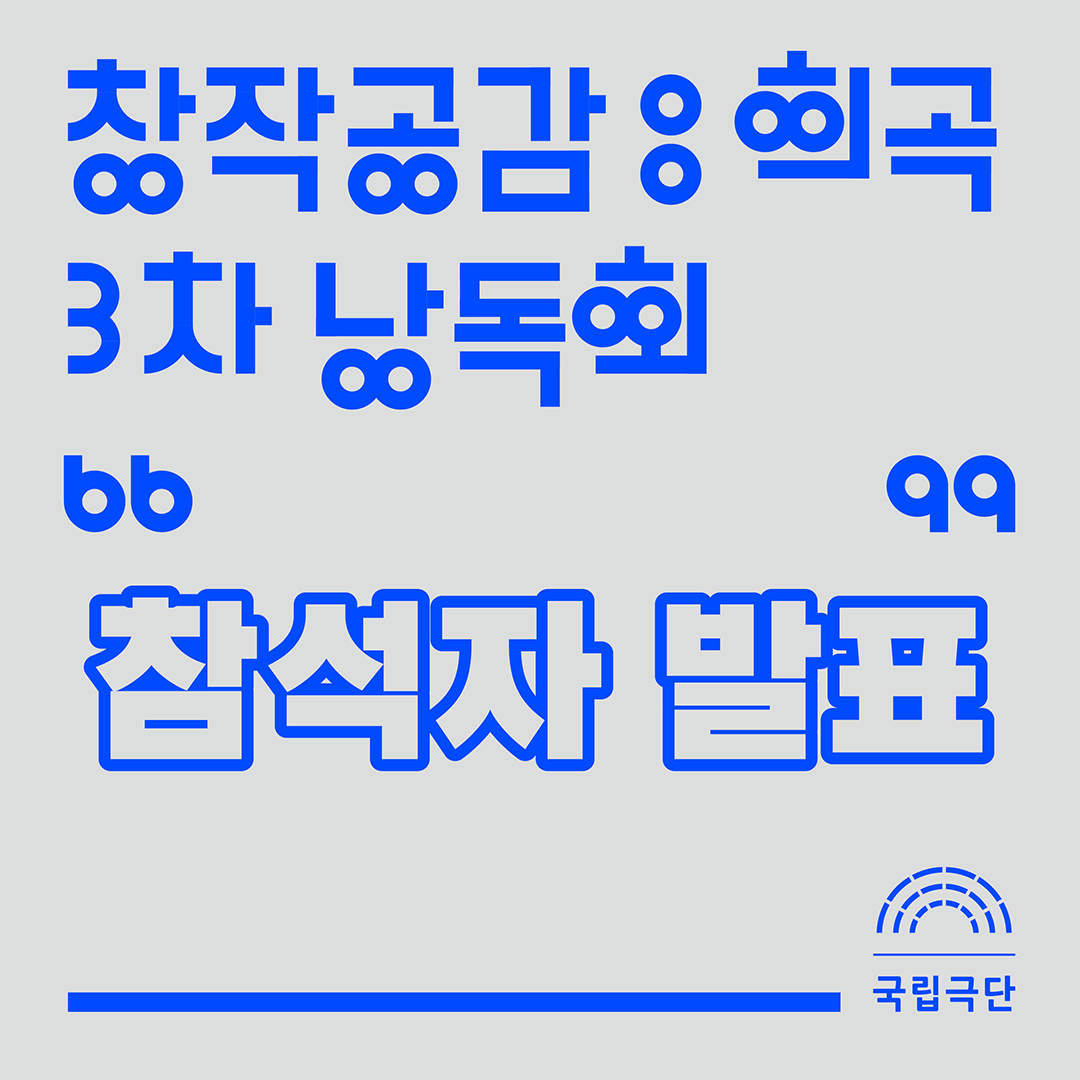 국립극단 [창작공감: 희곡] 3차 낭독회 관객 모집에 신청해 주신 모든 분들께 감사의 말씀드립니다. 한정된 인원만을 모시게 된 점 양해 부탁드리며 다음과 같이 참석자를 공지합니다.