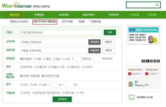 장애인고용포털 홈페이지(www.worktogether.or.kr) → 채용정보 → 간편우리지사채용정보