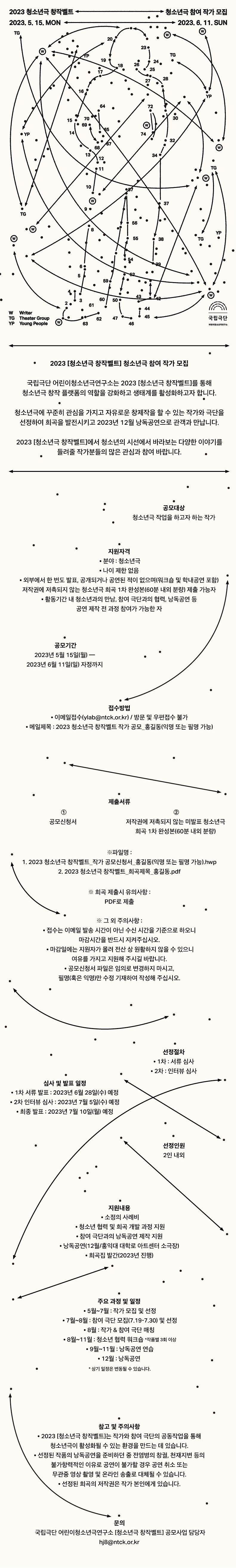 - 2023 [청소년극 창작벨트]는 작가와 참여 극단의 공동작업을 통해 청소년극이 활성화될 수 있는 환경을 만드는 데 있습니다.