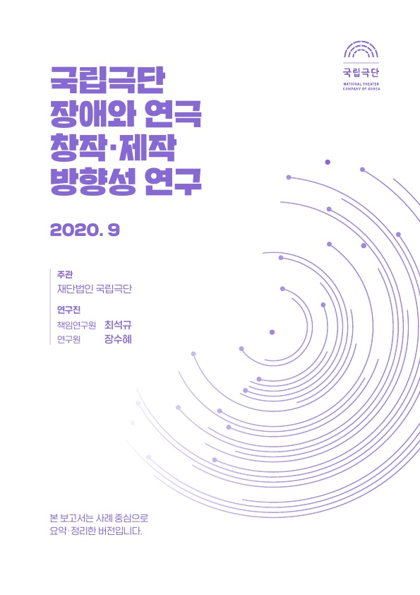 ● 공공문화예술기관에 부재한 장애인 창작자 접근성 확대 및 장애연극 제작 방향 연구를 시행함으로써 국립극단 장애 예술 사업의 중장기 정책 방안을 수립하기 위한 기초자료로 활용하기 위함