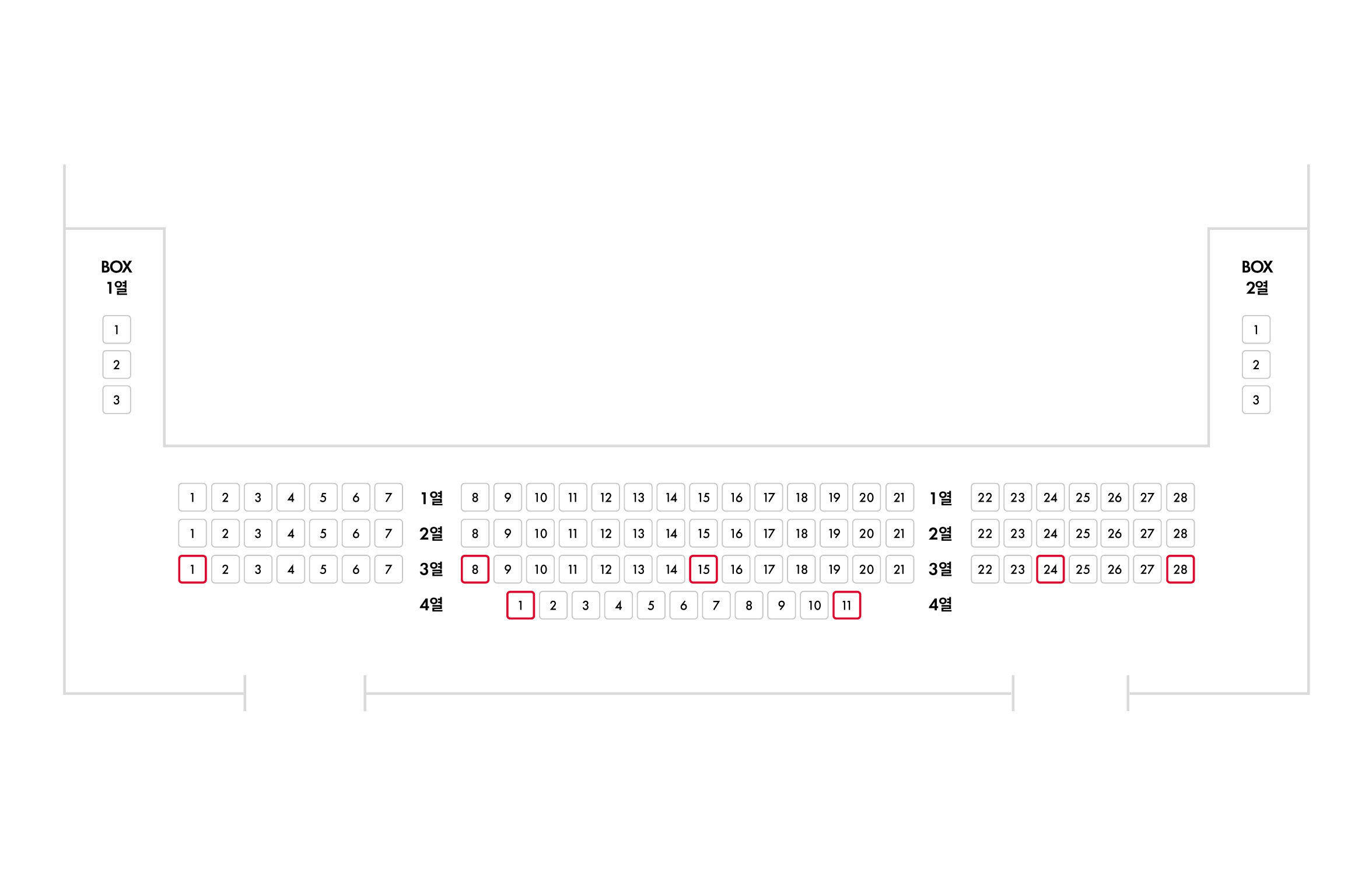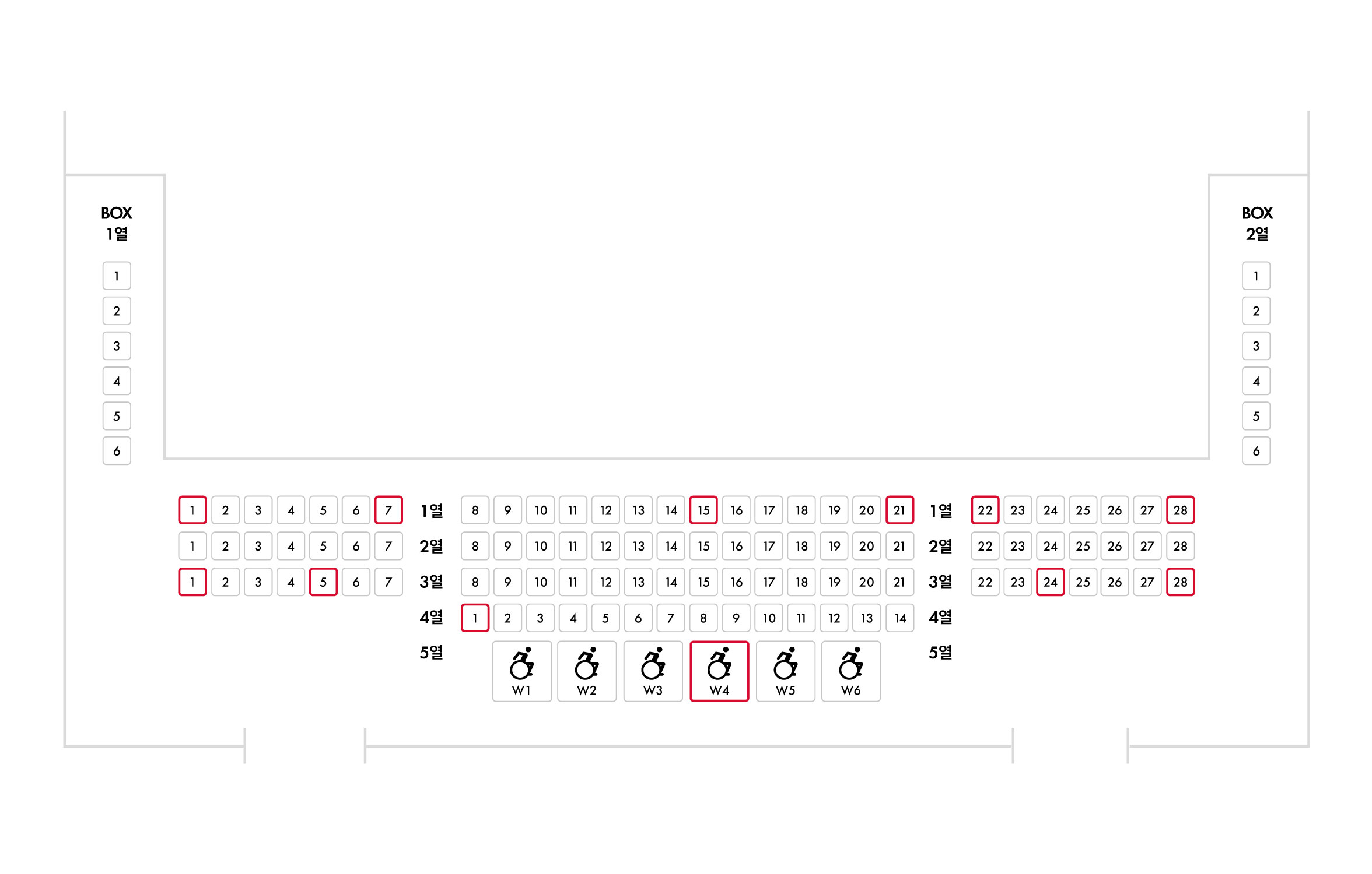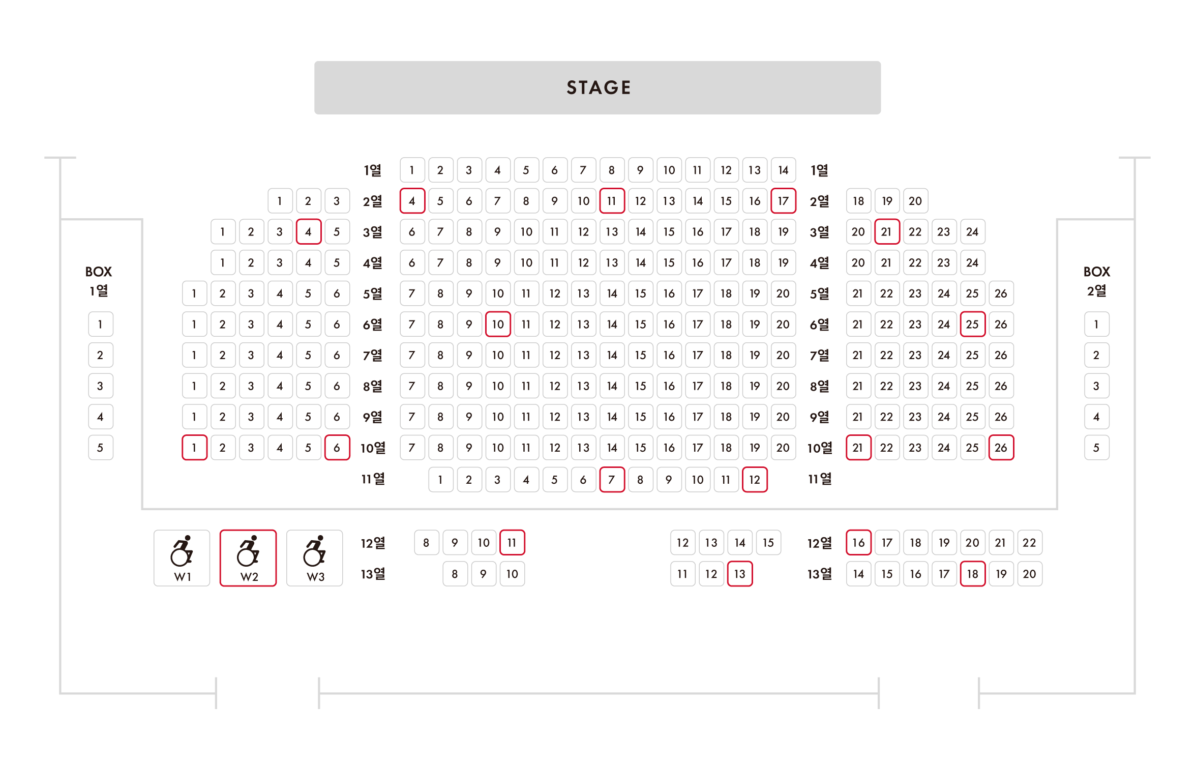 ※ 배치도에 표시된 빨간 좌석을 선택하시면 해당 좌석에서 촬영한 무대시각선을 확인하실 수 있습니다. 공연별 무대세트, 관객의 눈높이 등에 따라 해당 사진과 실제 시야가 다를 수 있습니다.