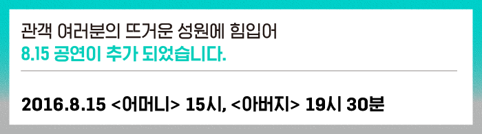 - 주말(토요일, 일요일) 중 "동일한 날짜"에 <아버지>, <어머니> 두개 공연을 함께 관람하시는 분들께 드리는 특별 할인입니다.