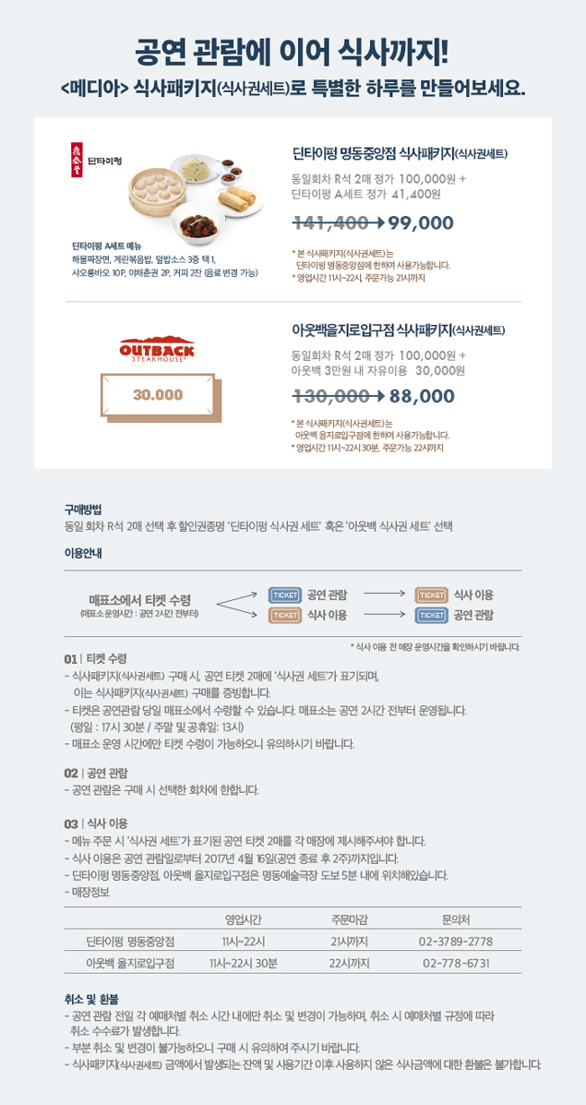 동일회차 R석 2매+ 아웃백 을지로입구점 식사권 (상세정보 관련 하단 이미지 확인 필)