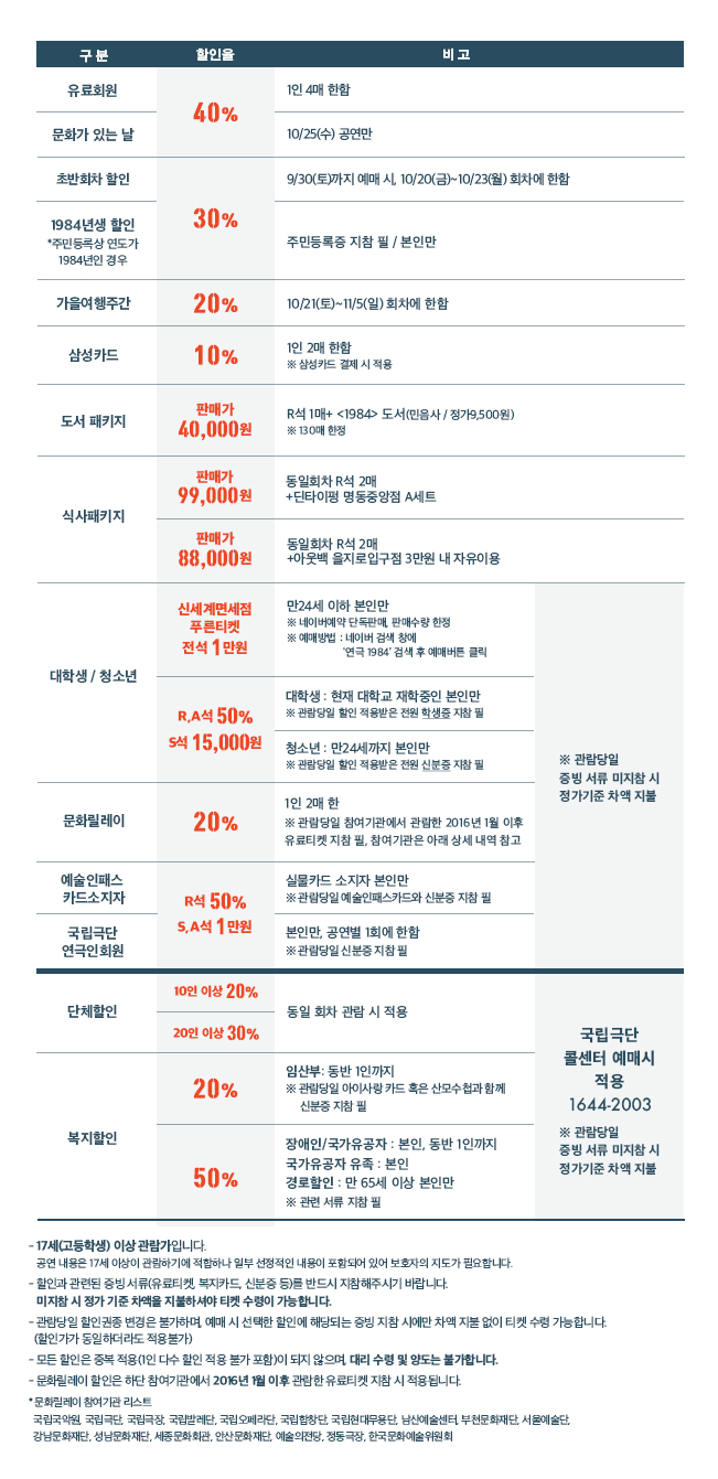 만24세 이하 본인만 ※ 네이버예약 단독판매, 판매수량 한정 ※ 예매방법 : 네이버 검색 창에 ‘연극 1984’ 검색 후 예매버튼 클릭