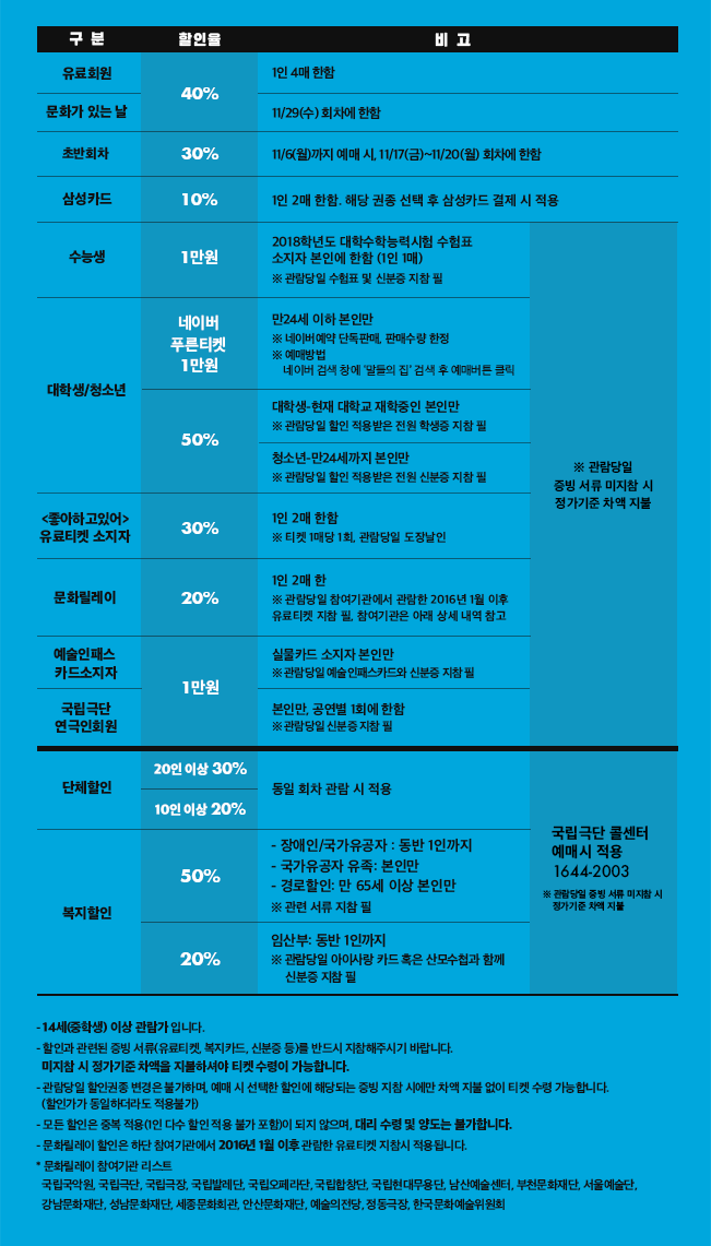 - 할인과 관련된 증빙 서류(유료티켓, 복지카드, 신분증 등)를 반드시 지참해주시기 바랍니다. 미지참 시 정가 기준 차액을 지불하셔야 티켓 수령이 가능합니다.