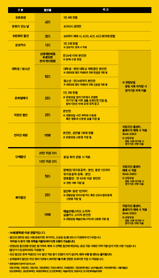 국립극단 콜센터 및 홈페이지 예매 시 적용 1644-2003