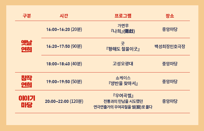 서계동 마당 공간을 정화하는 가면무<나희>를 시작으로 구수한 입담과 소리로 운을 불러오는 명창 박정욱의 <황해도 철물이 굿>이 시연되고, 인간문화재 이윤석이 이끄는 <고성오광대>로 연희마당 축제의 장이 열린다!