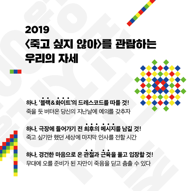 세상에 몸부림치는 청소년들의 절박함을 깨워낸 <죽고 싶지 않아>가 다시 한 번 기지개를 켠다. 2016년, 2018년의 벅찬 감동과 쇄도하는 앙코르 요청 끝에 돌아온 무대. 춤이라는 가장 강력한 심폐소생술은 지친 몸과 마음에 새 숨을 불어넣는다.