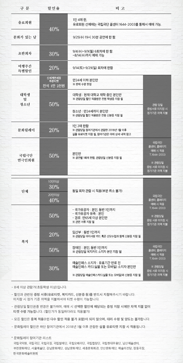 국립극단 콜센터, 홈페이지 예매 시 적용 T.1644-2003 ※ 관람당일 증빙 서류 미지참 시 정가기준 차액 지불