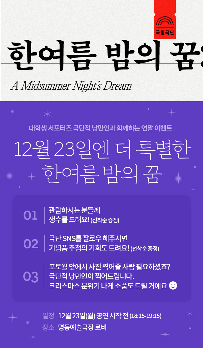시대를 뛰어넘는 역사상 최고의 스토리텔러 셰익스피어. 그의 5대 희극 중 대표작 <한여름 밤의 꿈>이 명동예술극장에 펼쳐진다. 푸릇푸릇한 네 연인들의 뒤엉킨 사랑, 그리고 숲의 정령과 요괴들까지 총출동하는 기묘한 판타지는 아름다운 언어에 현대적인 감각을 더해 환상적인 무대로 탄생한다. 찬바람 부는 겨울을 등지고, 오늘만큼은 무한한 꿈속에 빠진 채 여름밤의 설렘에 취해도 좋다.