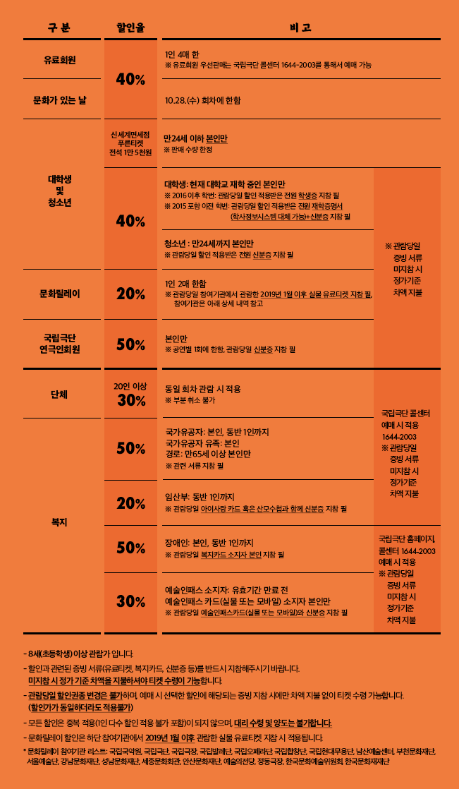 국립극단 콜센터 1644-2003 예매 시 적용 ※관람당일 증빙 서류 미지참 시 정가기준 차액 지불 |
