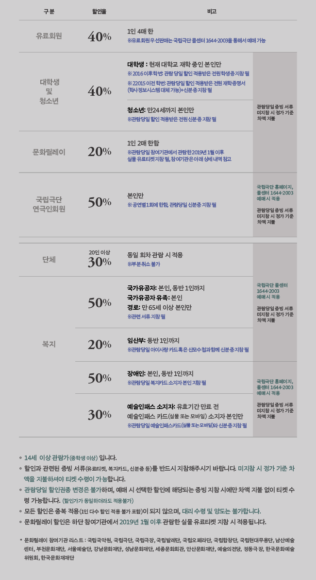 국립극단 콜센터 1644-2003 예매 시 적용 ※관람당일 증빙 서류 미지참 시 정가기준 차액 지불 |