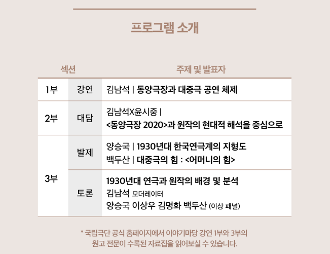 국립극단은 공연에 대한 다양한 정보를 더욱 많은 관객 분들과 나누고자 홈페이지에서 공연 프로그램을 무료로 제공하고 있습니다. (2018년 9월 1일 이후) 공연 프로그램 다운로드 공연 교육자료 다운로드