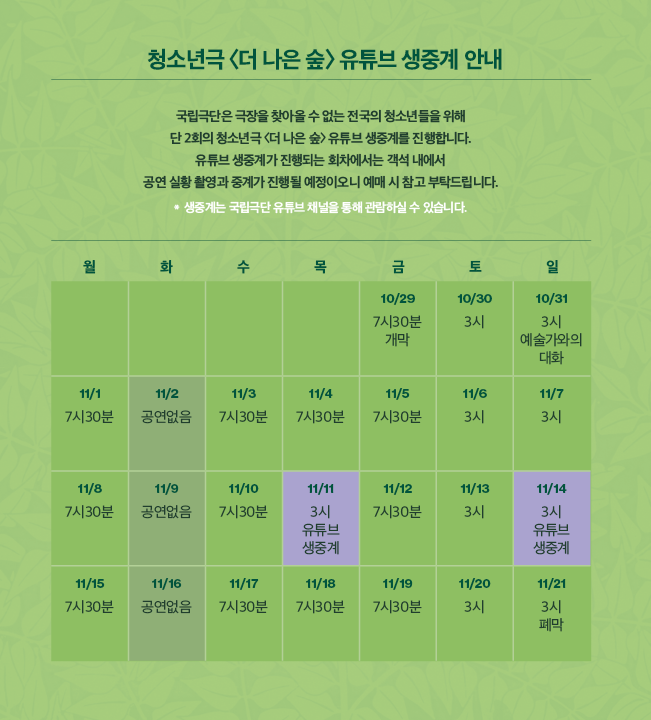 평일 19시 30분 / 토, 일 15시 (화 공연없음) *단, 11.11.(목) 15시
