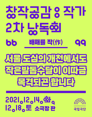 공모를 통해 선정된 세 명의 작가(김도영, 배해률, 신해연)는 작품개발 과정 동안 창작활동비를 비롯하여 특강·리서치·워크숍·자문 등 필요한 여러 활동을 지원받으며, 1, 2차 낭독회를 거쳐 차기 년도 공연 발표까지 창작의 전 과정을 국립극단과 협업합니다.