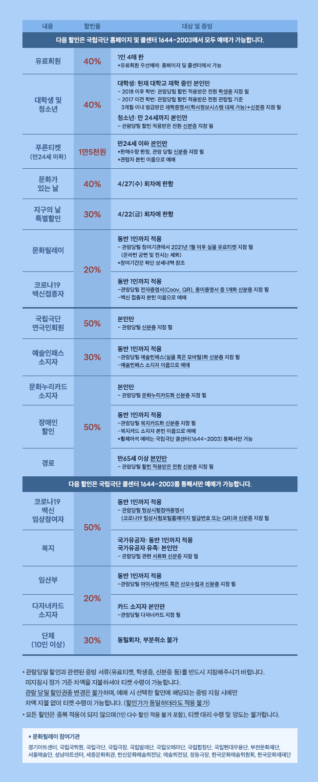 - 다음 할인은 국립극단 홈페이지 및 콜센터 1644-2003에서 모두 예매가 가능합니다.
