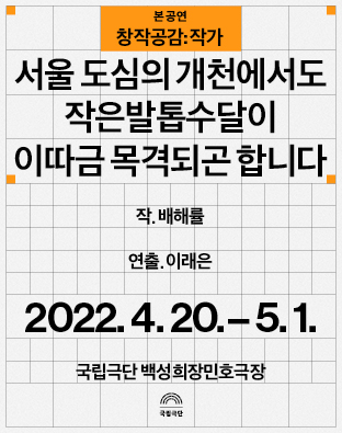 ![[창작공감: 작가] 본 공연 - 서울 도심의 개천에서도 작은발톱수달이 이따금 목격되곤 합니다 포스터](/upload/perfIntroPoster/22032318363118254204.jpg)