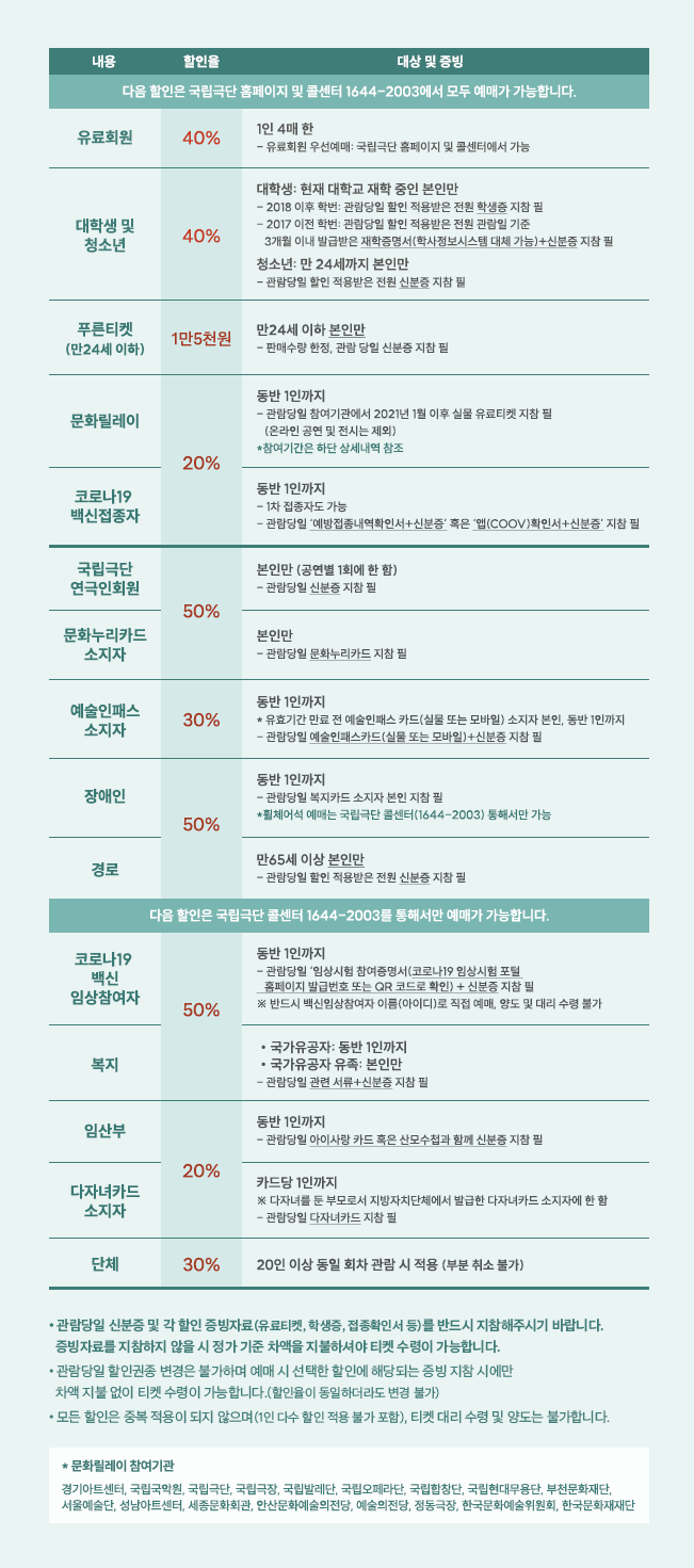- 다음 할인은 국립극단 홈페이지 및 콜센터 1644-2003에서 모두 예매가 가능합니다.