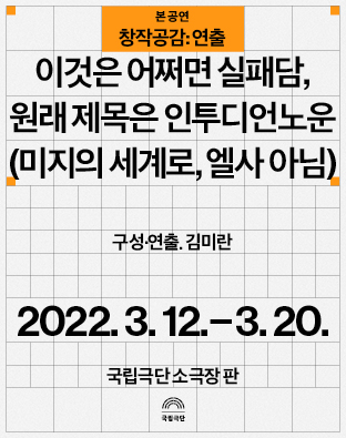 ![[창작공감: 연출] 본 공연 - 이것은 어쩌면 실패담, 원래 제목은 인투디언노운(미지의 세계로, 엘사 아님) 포스터](/upload/perfIntroPoster/22021117141996827635.jpg)