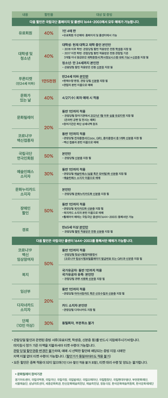 ▶ 다음 할인은 국립극단 홈페이지 및 콜센터 1644-2003에서 모두 예매가 가능합니다.
