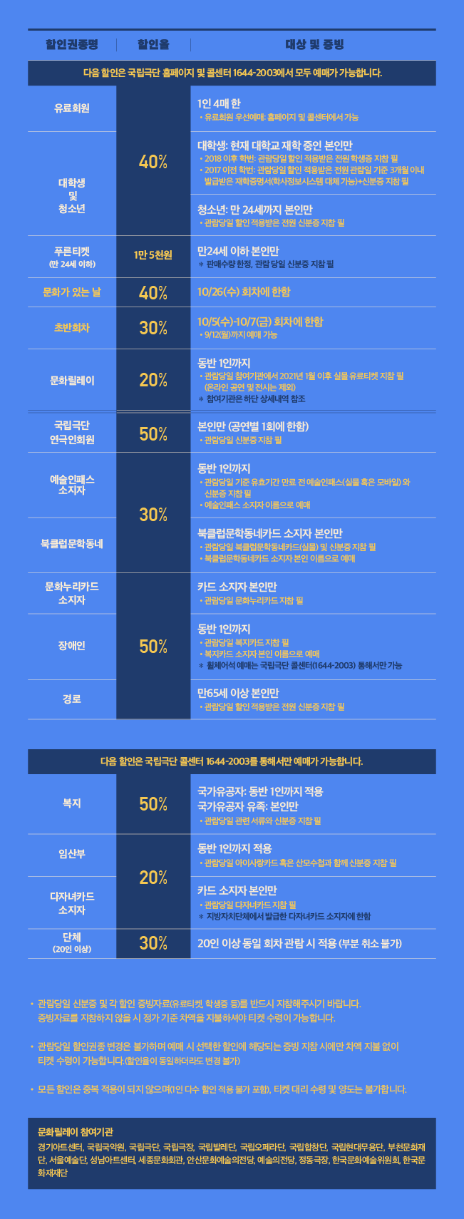 ? 다음 할인은 국립극단 홈페이지 및 콜센터 1644-2003에서 모두 예매가 가능합니다. |