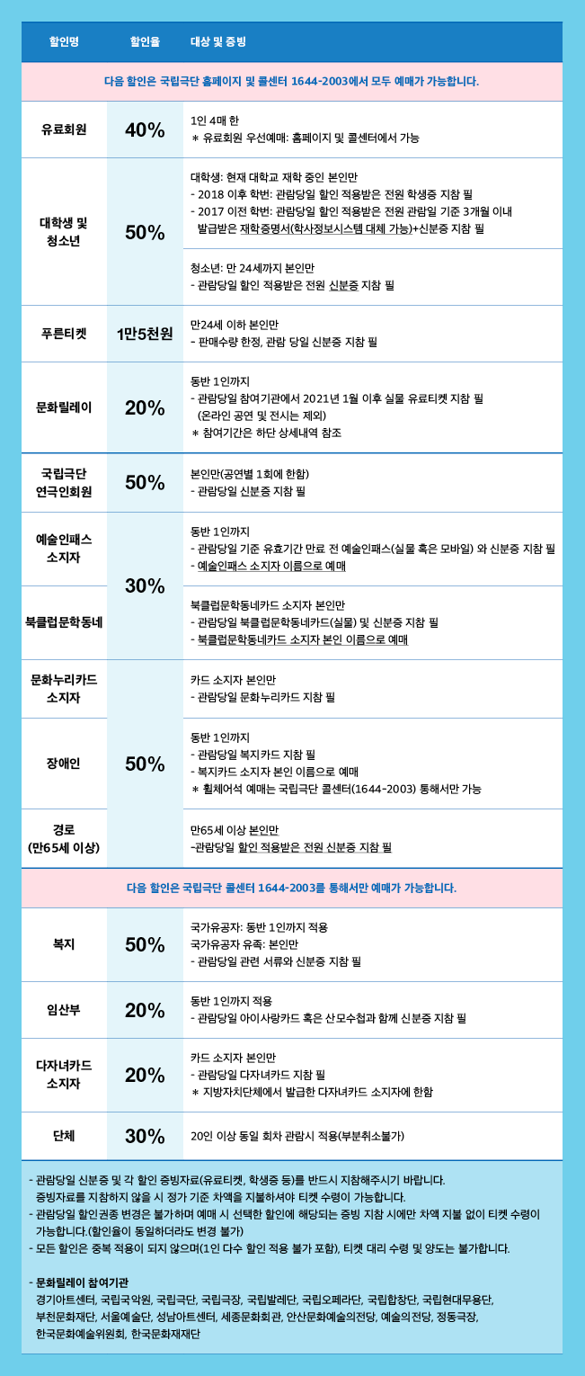 ▶ 다음 할인은 국립극단 홈페이지 및 콜센터 1644-2003에서 모두 예매가 가능합니다.