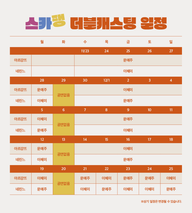 -아르강뜨 役과 네린느 役은 문예주 배우와 이혜미 배우가 교차로 출연합니다. 예매 및 관람에 참고 부탁드립니다.