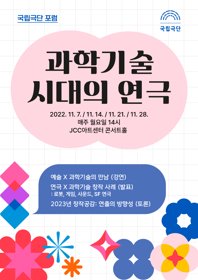 국립극단은 이런 질문들을 가진 창작자들과 함께 공부하기 위해 포럼 <과학기술 시대의 연극>을 마련했습니다. 그리고 2023년 [창작공감: 연출] 을 통해 ‘과학기술과 예술’을 주제로 작품을 만들어 보려고 합니다.