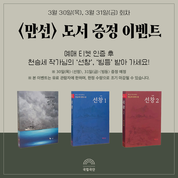 바다를 터전 삼아 살아가는 이들의 삶을 입체감 있게 그려내어 찬사를 받은 <만선>이 2023 국립극단의 무대를 연다. 교과서에 실리며 누구나 봐야 할 수작으로 꼽힌 작가 천승세의 <만선>은 연출가 심재찬의 깊이 있는 해석에 사실적이고 생생한 무대가 더해져 보다 강렬하게 돌아온다.