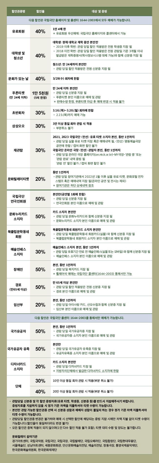 다음 할인은 국립극단 홈페이지 및 콜센터 1644-2003에서 모두 예매가 가능합니다. |