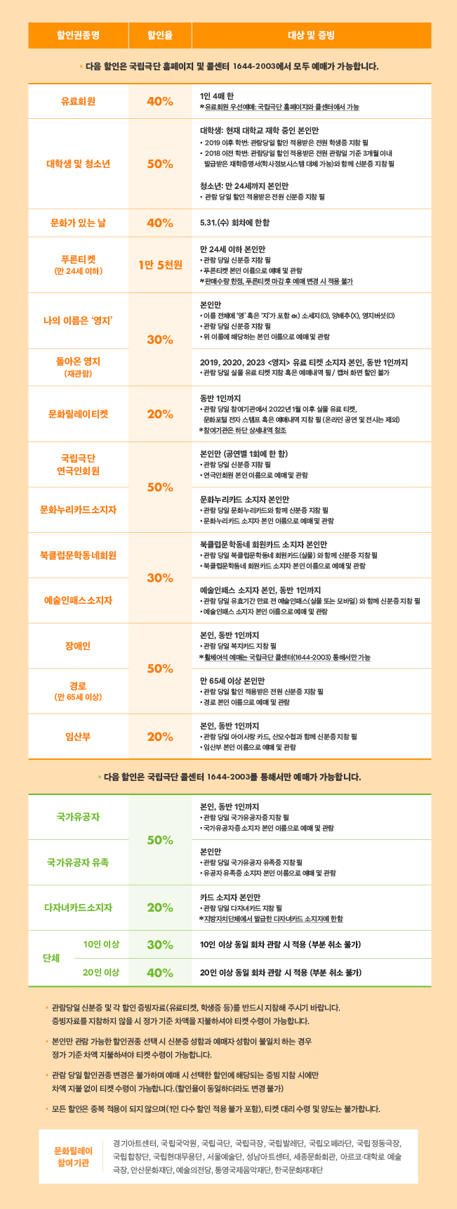 다음 할인은 국립극단 홈페이지 및 콜센터 1644-2003에서 모두 예매가 가능합니다. |