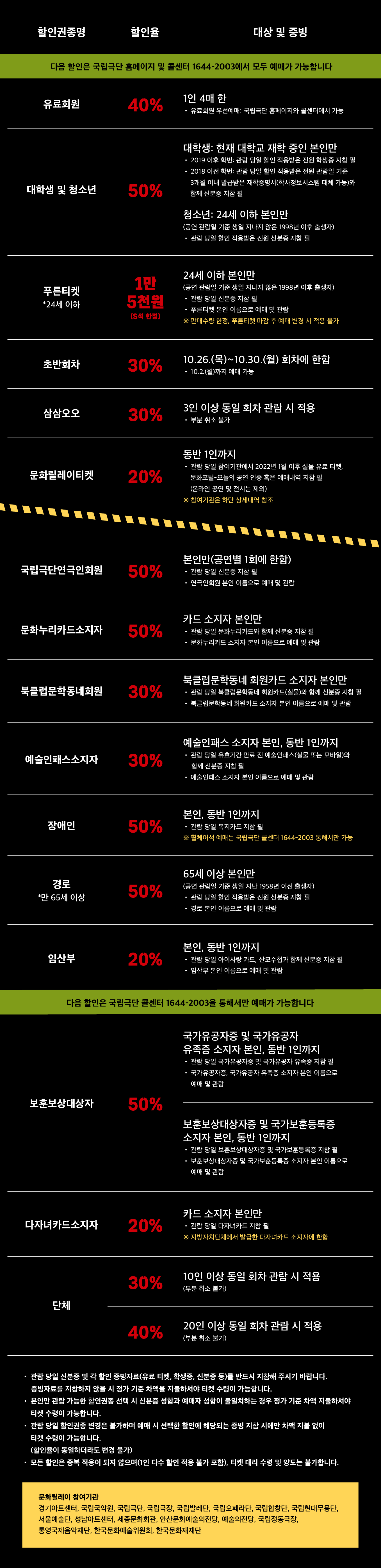 다음 할인은 국립극단 홈페이지 및 콜센터 1644-2003에서 모두 예매가 가능합니다. |