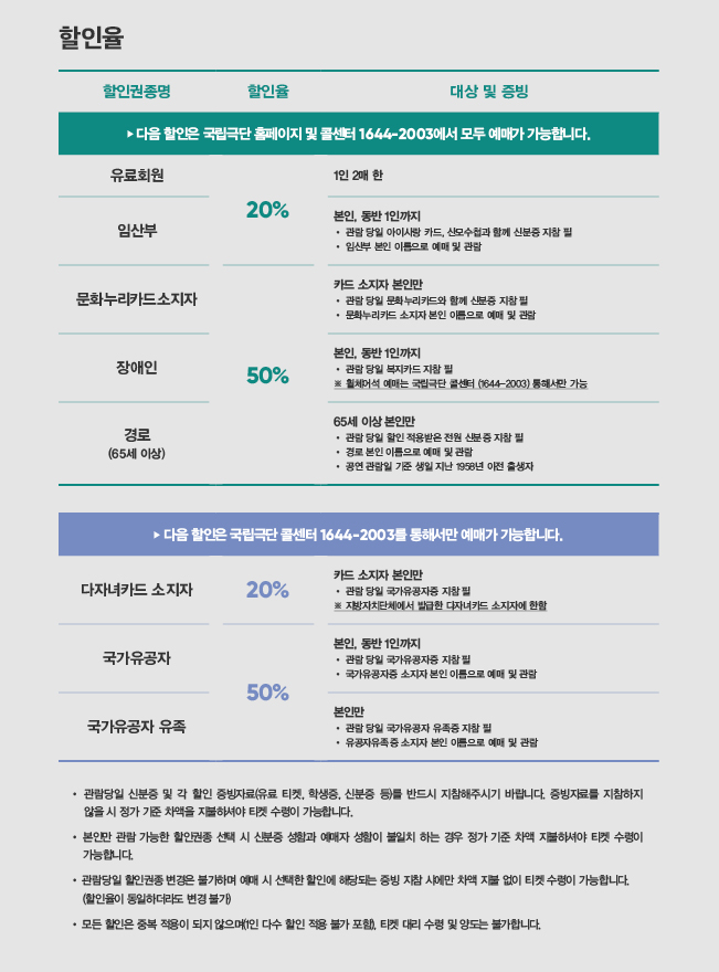 다음 할인은 국립극단 홈페이지 및 콜센터 1644-2003에서 모두 예매가 가능합니다. |
