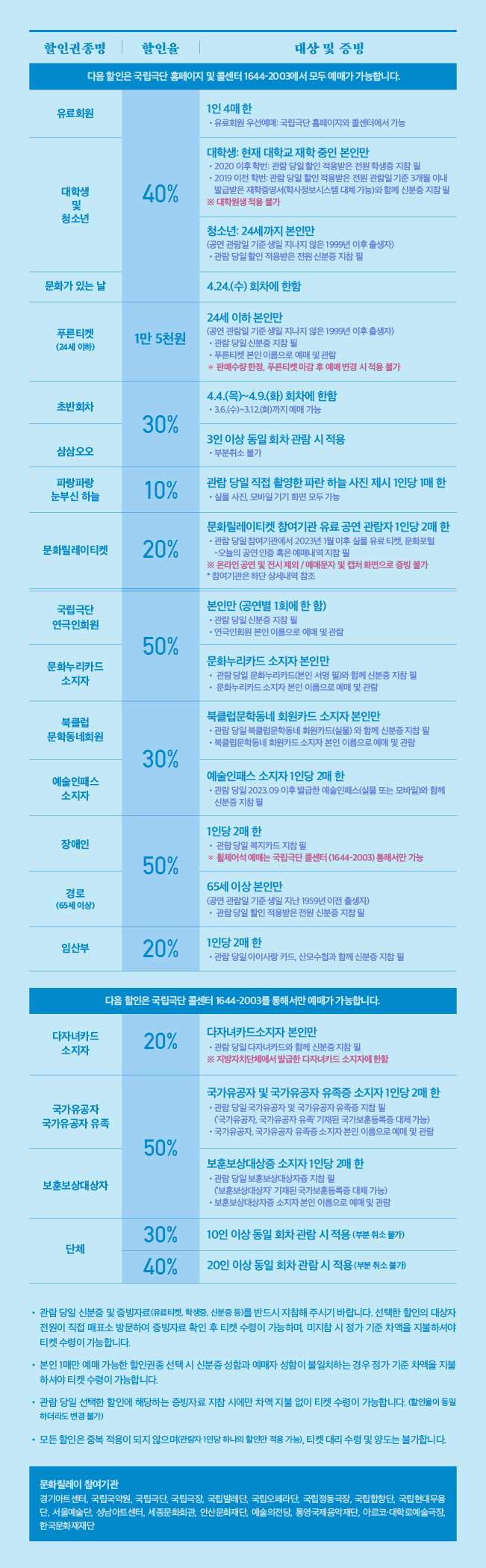 다음 할인은 국립극단 홈페이지 및 콜센터 1644-2003에서 모두 예매가 가능합니다. |