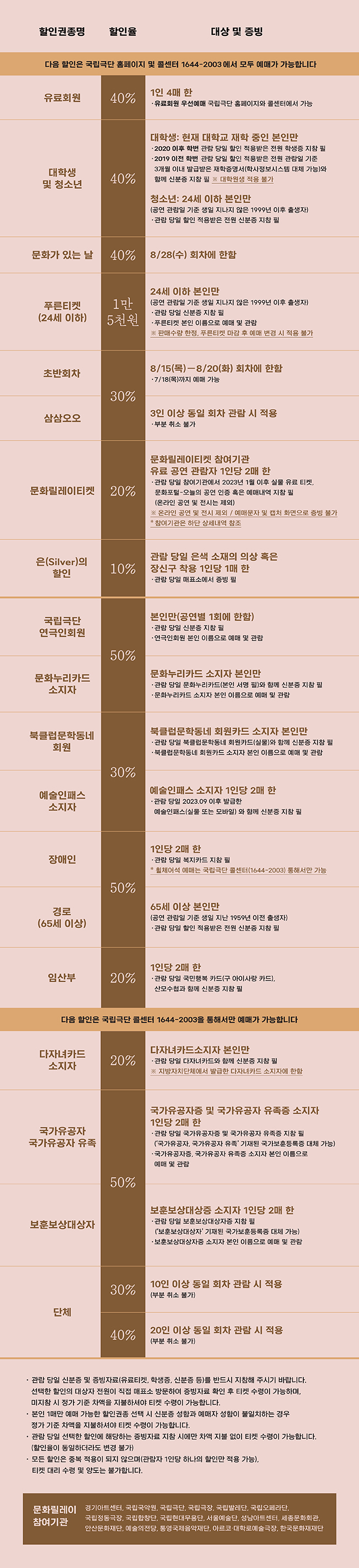 다음 할인은 국립극단 홈페이지 및 콜센터 1644-2003에서 모두 예매가 가능합니다. |