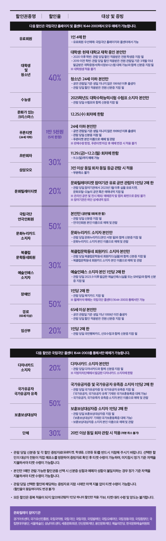 다음 할인은 국립극단 홈페이지 및 콜센터 1644-2003에서 모두 예매가 가능합니다. |