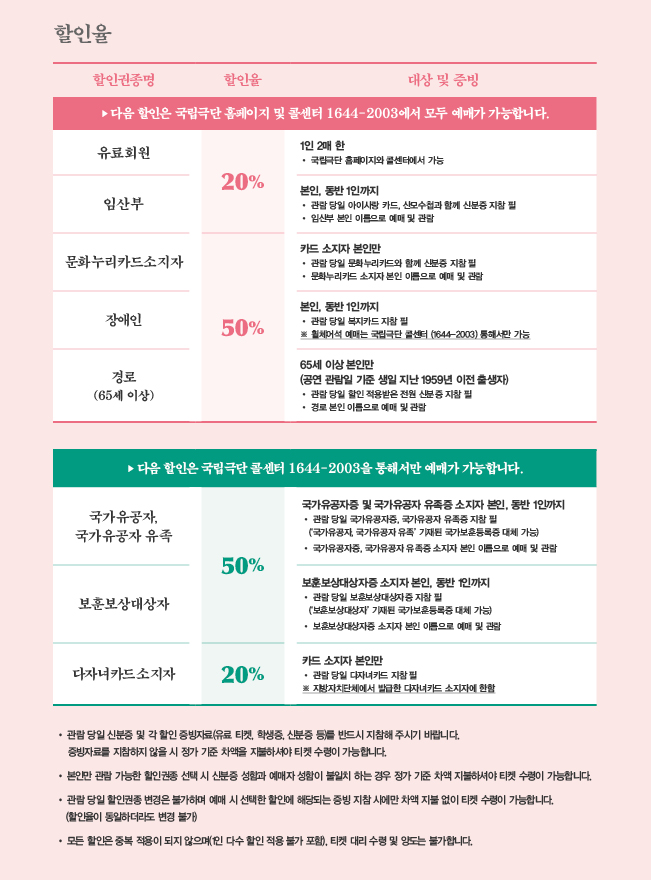 다음 할인은 국립극단 홈페이지 및 콜센터 1644-2003에서 모두 예매가 가능합니다. |