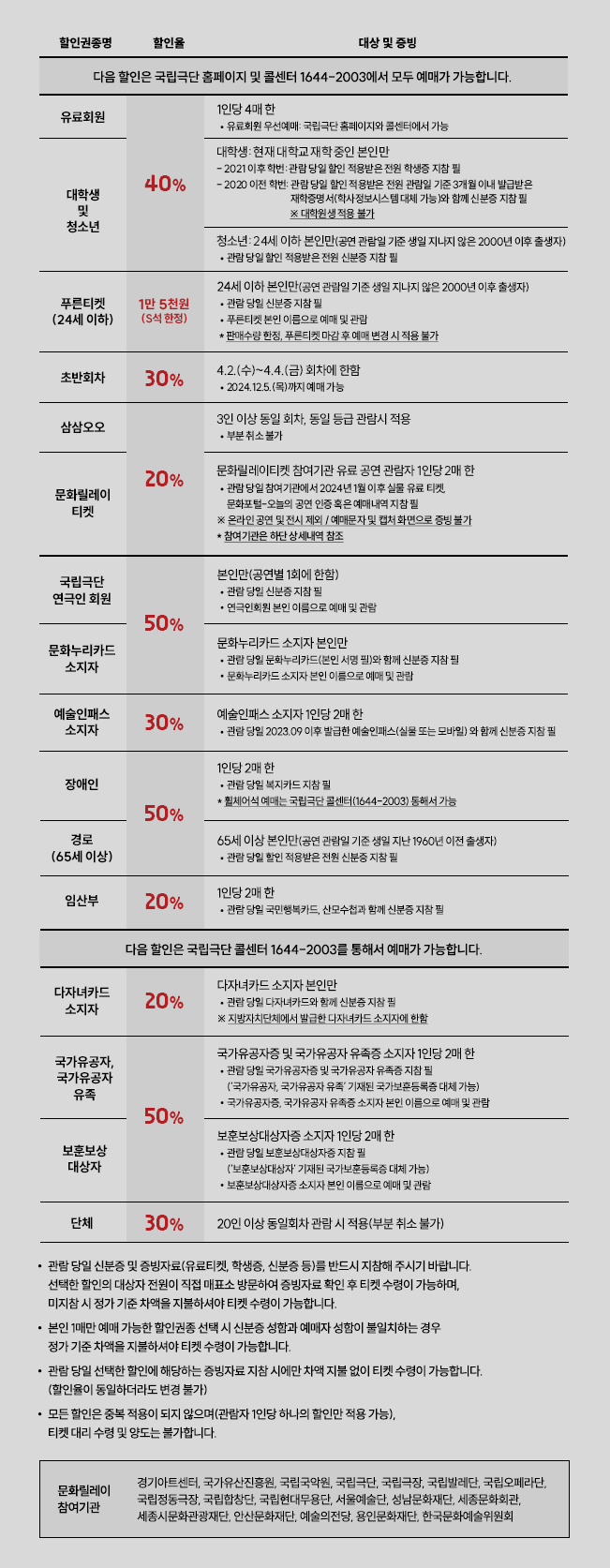 다음 할인은 국립극단 홈페이지 및 콜센터 1644-2003에서 모두 예매가 가능합니다. |
