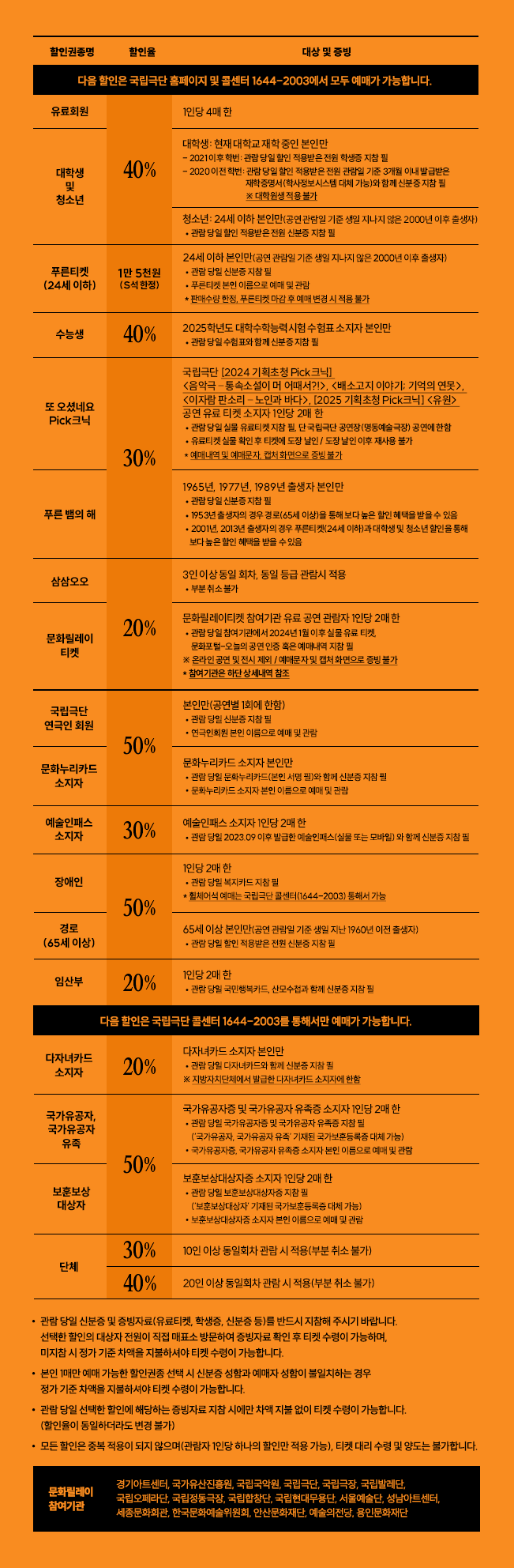 다음 할인은 국립극단 홈페이지 및 콜센터 1644-2003에서 모두 예매가 가능합니다. |