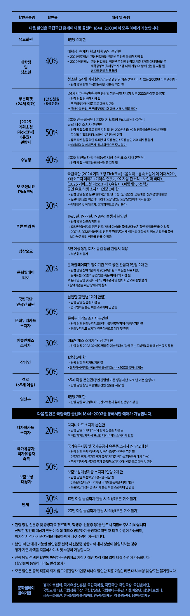 다음 할인은 국립극단 홈페이지 및 콜센터 1644-2003에서 모두 예매가 가능합니다. |