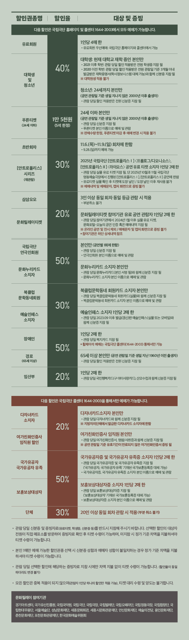 다음 할인은 국립극단 홈페이지 및 콜센터 1644-2003에서 모두 예매가 가능합니다. |